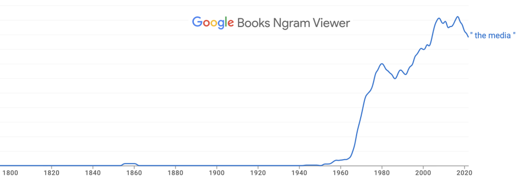 First, “the media” is a modern label, dating from the 1940s. Here’s Google’s Ngram Viewer, which charts mentions in books.